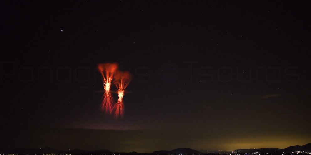 Τα «red sprites» απαθανάτισε ο Παναγιώτης Τσούρας. Το φαινόμενο εντοπίστηκε πάνω από την Ικαρία, κατά τη διάρκεια καταιγίδας. Πρόκειται για ένα διπλό red sprite. Όπως αναφέρει το meteo, ο κεραυνός είχε ένταση 76kA.