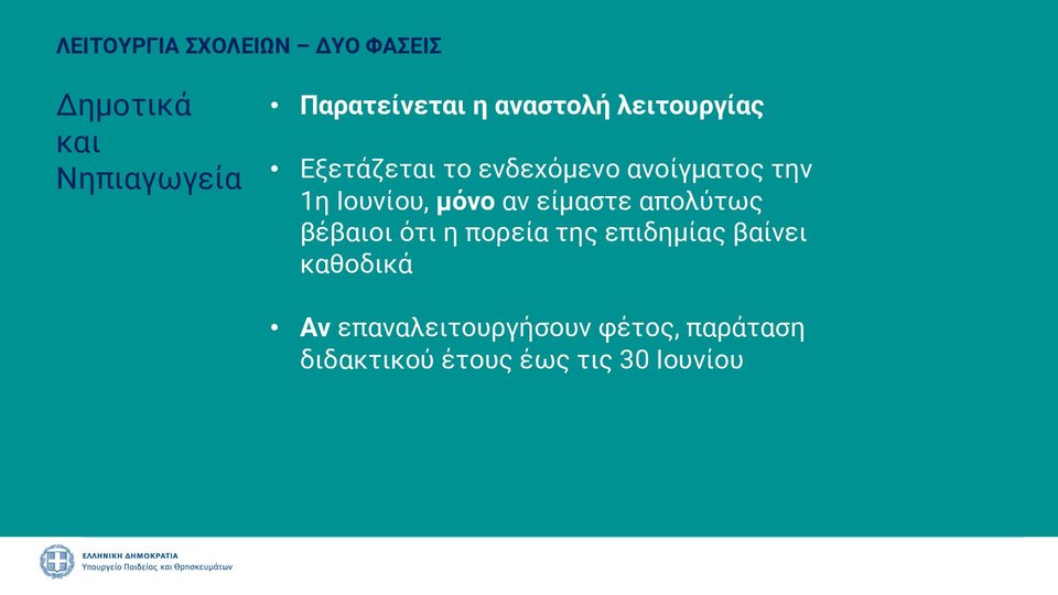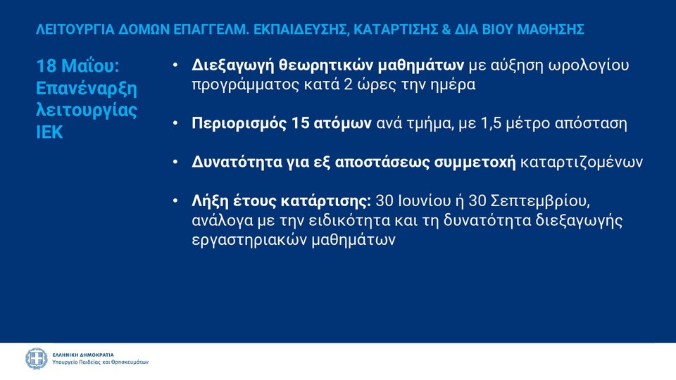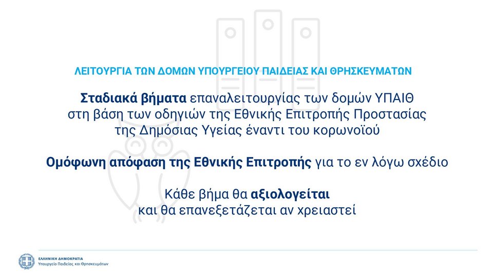Το σχέδιο «Σταδιακή Επαναλειτουργία Δομών Υπουργείου Παιδείας και Θρησκευμάτων», αφορά την επιστροφή των παιδειών στα θρανία, αλλά και το μακροχρόνιο πλάνο του υπουργείου για την έναρξη μέχρι και της επόμενης χρονιάς.
