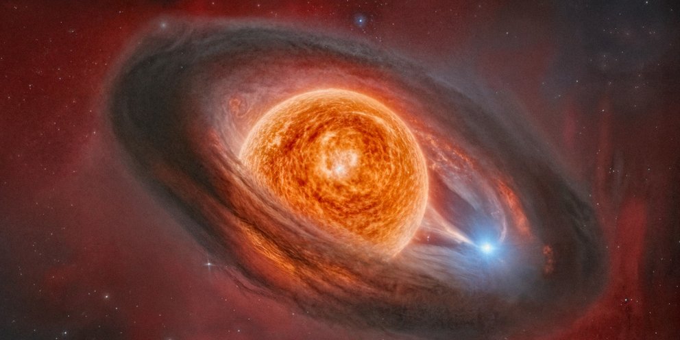 Σ.Σ. Επισυνάπτεται καλλιτεχνική απεικόνιση του WOH G64, κατά την πρόσφατη μεταμόρφωσή του, όπου αποκαλύπτεται ένας κίτρινος υπεργίγαντας και ένας θερμός συνοδός αστέρας, περιβαλλόμενοι από έναν δακτύλιο σκόνης. Credit: Daniel Cea Martinez. Η φωτογραφία έχει δημιουργηθεί με τεχνητή νοημοσύνη και την παραχώρησε το Εθνικό Αστεροσκοπείο Αθηνών στο ΑΠΕ-ΜΠΕ για χρήση.