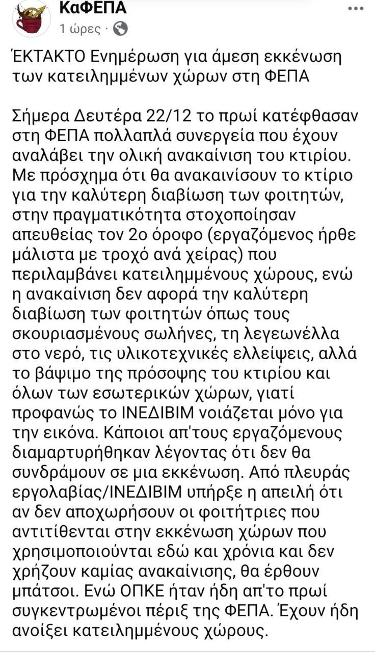 Μεγάλη επιχείρηση εκκένωσης από καταληψίες σε χώρους της Φοιτητικής Εστίας του Πανεπιστημίου Αθηνών (ΦΕΠΑ) στου Ζωγράφου έλαβε χώρα τα ξημερώματα.