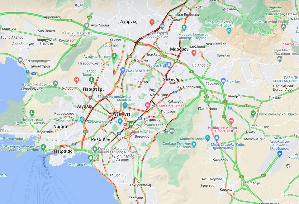 Στα «κόκκινα» είναι οι κεντρικοί δρόμοι της Αθήνας, αλλά και ο Κηφισός, κυρίως στο ρεύμα καθόδου.