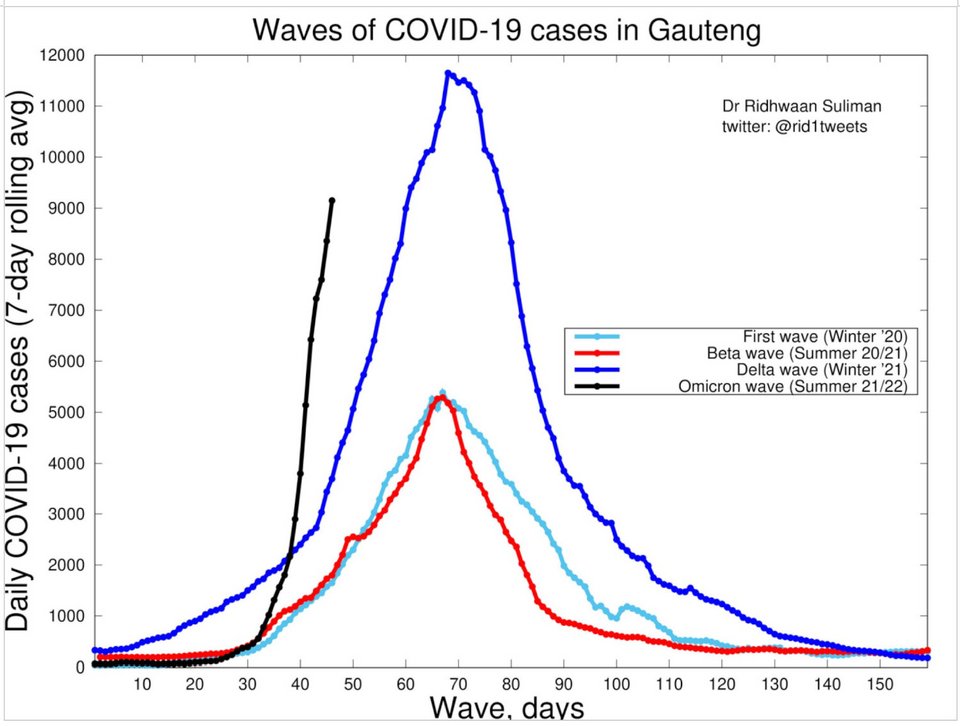 Στο παρακάτω γράφημα του Dr Ridhwann Suliman συγκρίθηκε η κλίση της καμπύλης των κρουσμάτων στην αρχή της εμφάνισης του κύματος της «Όμικρον» με την αντίστοιχη κλίση των προηγούμενων κυμάτων που σχημάτισαν η «Άλφα», η «Βήτα» και η «Δέλτα» μετάλλαξη. Τα δεδομένα αφορούν μέσο όρο κρουσμάτων 7 ημερών της περιοχής Gauteng της νότιας Αφρικής. Η σύγκριση δείχνει ότι η «Όμικρον» έχει εξαιρετικά απότομη ανοδική κλίση σε σχέση με τις προηγούμενες μεταλλάξεις. Αυτή η κλίση αποδεικνύει πολύ υψηλή μεταδοτικότητα.