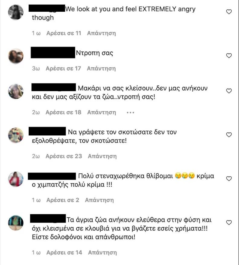Tα σχόλια στο Ιnstagram του Αττικού Ζωολογικού Πάρκου είναι πολλά κατά της διοίκησης και της απόφασης που πήραν να θανατώσουν τον χιμπατζή.