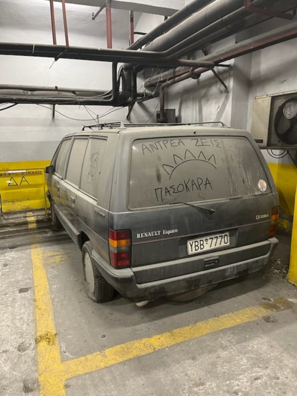 «Ανδρέα ζεις, ΠΑΣΟΚΑΡΑ» είχαν γράψει πάνω στην σκόνη που κάλυπτε το πίσω τζάμι του Renault Espace, ενός άνετου οικογενειακού οχήματος, το οποίο βρισκόταν στο πάρκινγκ κτηρίου της οδού Λιοσίων εδώ και 33 χρόνια.