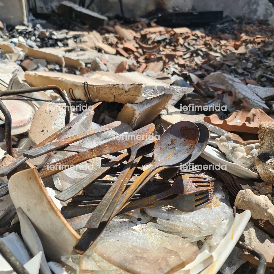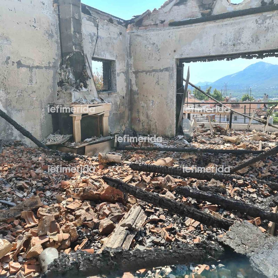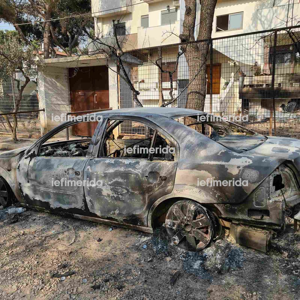 Το διώροφο σπίτι μπροστά τους, στην πρόσοψη φαίνεται αλώβητο, όμως δέχθηκε την επίθεση της φωτιάς που σάρωσε την Αττική από την πίσω πλευρά. Οι φλόγες πέρασαν στο εσωτερικό και σε λίγα λεπτά αφάνισαν τα πάντα, λιώνοντας ακόμα και τις ηλεκτρικές συσκευές. Μισοκαμένα ρούχα, σπασμένα πιάτα και φλιτζάνια, μαυρισμένα μαχαιροπήρουνα, λιωμένα έπιπλα σχηματίζουν ένα θλιβερό σωρό.