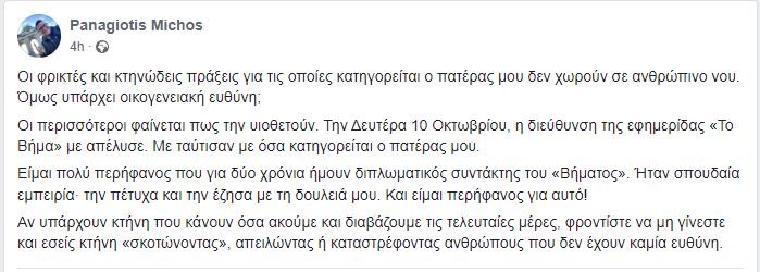Ο Παναγιώτης Μίχος είχε αναρτήσει νωρίτερα ότι απολύθηκε από το «Βήμα» μετά την αποκάλυψη της δράσης του πατέρα του, κάνοντας λόγο για «φρικτές και κτηνώδεις πράξεις», που δεν χωρούν σε ανθρώπινο νου. Ωστόσο, κατηγόρησε την εφημερίδα «Το Βήμα» ότι τον απέλυσαν, ταυτίζοντάς τον με όσα κατηγορείται ο πατέρας του, σημειώνοντας ότι δεν υπάρχει οικογενειακή ευθύνη.