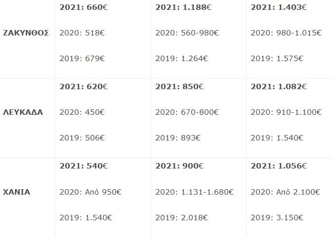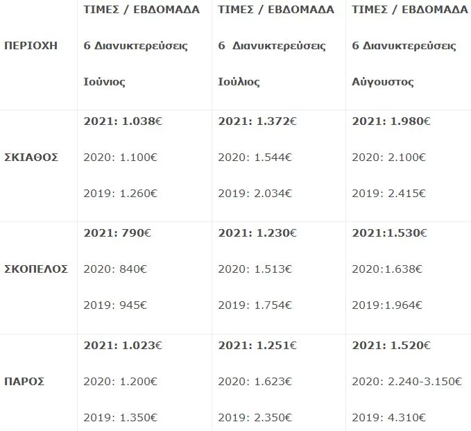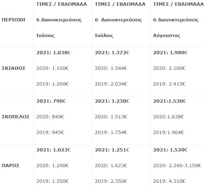 Στη Σκιάθο η πληρότητα κυμαίνεται από 94% έως 97%, στη Σκόπελο από 88% έως 94%, στην Πάρο από 87% έως 91%, στη Ζάκυνθο αγγίζει το 86% και στα Χανιά από 86% έως 89% για τους μήνες Ιούνιο, Ιούλιο και Αύγουστο.