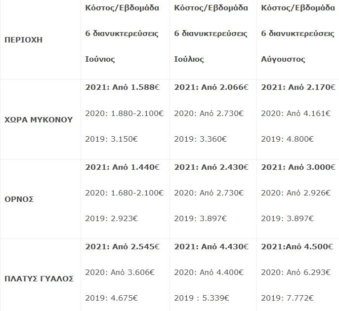 Για τη Μύκονο, σύμφωνα με το Πανελλαδικό Δίκτυο E–Real Estates, από την έρευνα που έγινε σε διεθνώς γνωστές ιστοσελίδες στην οποία έχουν εγγραφεί ακίνητα που διατίθενται μέσω βραχυχρόνιας μίσθωσης ή/ και με σήμα του ΕΟΤ, οι διαθέσιμες βίλες με ιδιωτική πισίνα τον μήνα Ιούνιο αγγίζουν τις 143, τον Ιούλιο 117 και τον Αύγουστο 124.