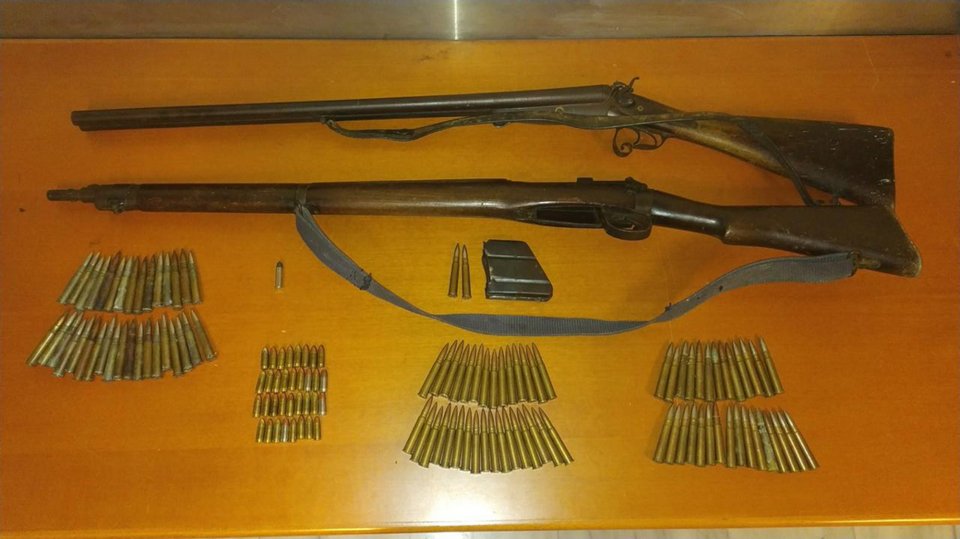 Από τις έρευνες, μεταξύ άλλων, βρέθηκαν και κατασχέθηκαν πολεμικό τυφέκιο με γεμιστήρα, δίκαννο, -2- καραμπίνες, από τις οποίες η μία χωρίς σειριακό αριθμό, -145- φυσίγγια και -9- μαχαίρια, τα οποία θα αποσταλούν για εργαστηριακή εξέταση.