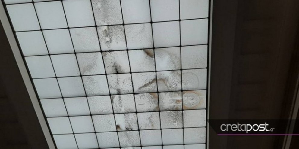 Η οροφή είναι διαβρωμένη με εμφανή τα σημάδια από το πέρασμα του νερού, ενώ και στην τοιχοποιία δίπλα στα εκθέματα παρατηρείται μούχλα.