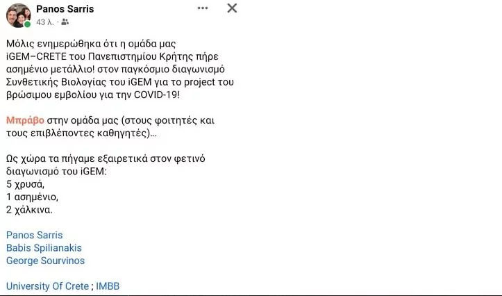 Όπως ενημερώνει ο επίκουρος καθηγητής Μικροβιολογίας στο Τμήμα Βιολογίας του Πανεπιστημίου Κρήτης και επίτιμος καθηγητής στο Πανεπιστήμιο Exeter, Δρ. Παναγιώτης Φ. Σαρρής, η ομάδα διακρίθηκε στον παγκόσμιο διαγωνισμό Συνθετικής Βιολογίας του iGEM αποσπώντας το ασημένιο μετάλλιο! «Μπράβο στην ομάδα μας, στους φοιτητές και τους επιβλέποντες καθηγητές» σημειώνει μεταξύ άλλων ο κ. Σαρρής.