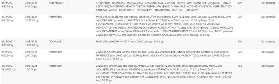 Διακοπή ρεύματος έχει προγραμματίσει για σήμερα, Τρίτη, 31 Αυγούστου, ο ΔΕΔΔΗΕ, σε αρκετές περιοχές της Αττικής, στις οποίες περιλαμβάνονται το κέντρο της Αθήνας, στα Άνω Λιόσια και Γλυφάδα.