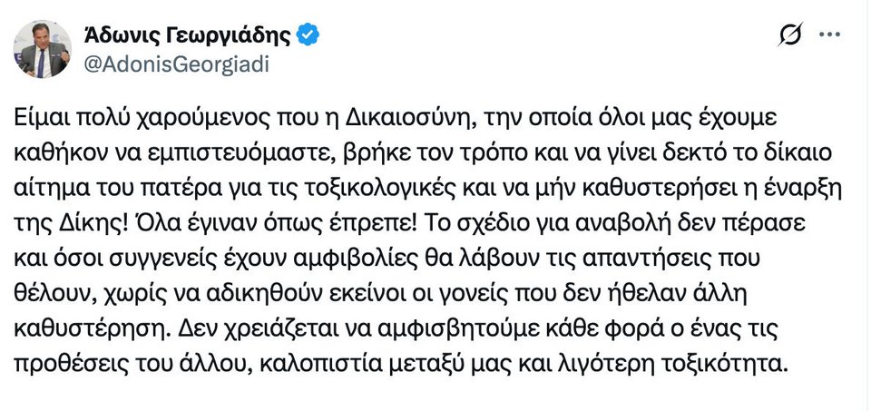 «Είμαι πολύ χαρούμενος που η Δικαιοσύνη, την οποία όλοι μας έχουμε καθήκον να εμπιστευόμαστε, βρήκε τον τρόπο και να γίνει δεκτό το δίκαιο αίτημα του πατέρα για τις τοξικολογικές και να μην καθυστερήσει η έναρξη της Δίκης!», έγραψε ο Άδωνις Γεωργιάδης σε ανάρτησή του στο Χ, μόλις ενημερώθηκε για το θέμα.