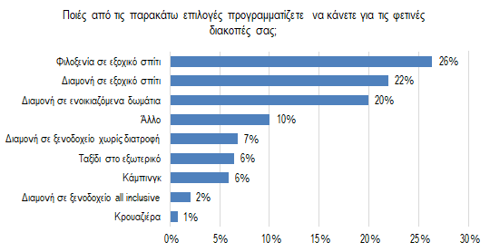 Όπως προκύπτει από τα αποτελέσματα της έρευνας, η πλειοψηφία του κοινού επιλέγει τις εξοχικές κατοικίες, είτε φιλοξενία (26%), είτε διαμονή (22%). Το 20% επιλέγει διαμονή σε ενοικιαζόμενα δωμάτια και μόνο το 9% διαμονή σε ξενοδοχεία (7% χωρίς διατροφή και 2% με πλήρη διατροφή). Το 6% επιλέγει camping και το 6% επιλέγει ταξίδι στο εξωτερικό.