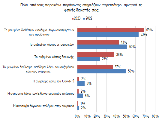 Παρόλα αυτά, σύμφωνα με τους ερωτηθέντες, η δαπάνη τους για τις φετινές διακοπές εκτιμάται ότι θα είναι μειωμένη κατά 15%. Αναφορικά με τους λόγους, από την έρευνα προκύπτει ότι κυρίως οφείλεται στο μειωμένο εισόδημα λόγω των ανατιμήσεων των προϊόντων (με αύξηση από 63% σε 69%), ακολουθεί το κόστος μεταφορικών (με μείωση από 52% σε 43%), το αυξημένο κόστος διαμονής (με αύξηση από 23% σε 38%) και το μειωμένο εισόδημα λόγω κόστους ενέργειας (με μείωση από 50% σε 37%).