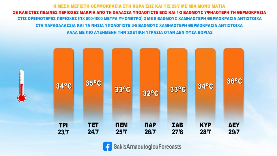 «Η μέση μέγιστη θερμοκρασία στη χώρα έως και τις 29/7 με μια μόνο ματιά. Σε κλειστές πεδινές περιοχές μακριά από τη θάλασσα υπολογίστε έως και 1-2 βαθμούς υψηλότερη τη θερμοκρασία. Στις ορεινότερες περιοχές (πχ 500-1000 μέτρα υψόμετρο) 3 με 6 βαθμούς χαμηλότερη θερμοκρασία. Αντίστοιχα στα παραθαλάσσια και τα νησιά υπολογίστε 3-5 βαθμούς χαμηλότερη θερμοκρασία αντίστοιχα αλλά με πιο αυξημένη την σχετική υγρασία όταν δεν φυσά βοριάς».