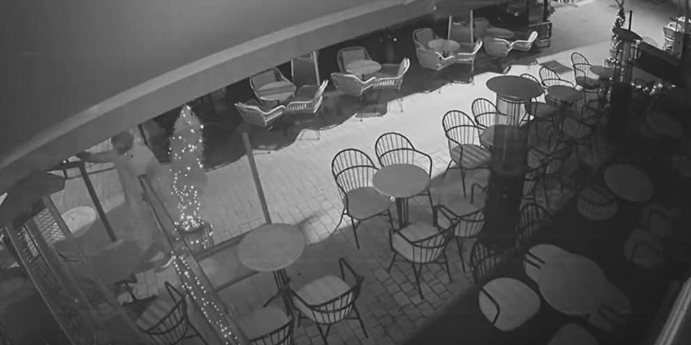 Η αρχή έγινε την περασμένη Δευτέρα, περίπου στη 1:00, με την κάμερα να καταγράφει τον διαρρήκτη, ενώ είχε κλέψει, να επιχειρεί να κατεβεί από την τέντα της καφετέριας.