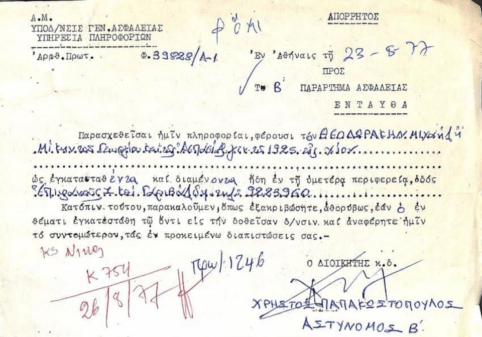 Μάλιστα, σε αυτό το σπίτι, σύμφωνα με έγγραφο του 1977, η Αστυνομία παρακολουθούσε τον μεγάλο μουσικοσυνθέτη ακόμα και την περίοδο μετά τη Χούντα των συνταγματαρχών.