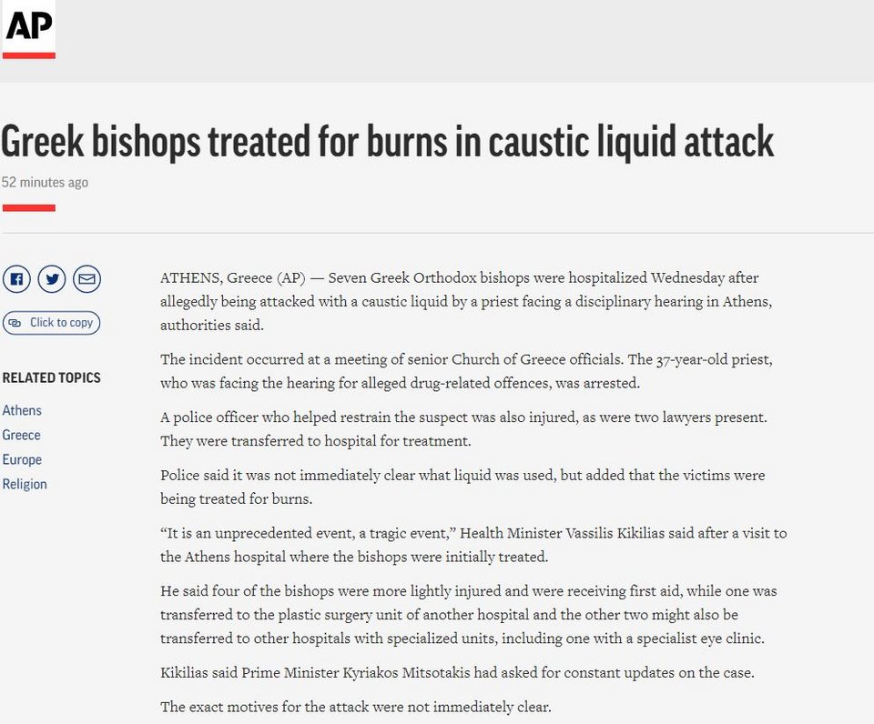 «Έλληνες μητροπολίτες νοσηλεύονται με εγκαύματα έπειτα από επίθεση με καυστικό υγρό», είναι ο τίτλος του δημοσιεύματος του Associated Press, που μεταδίδει επίσης την είδηση. Το αμερικανικό μέσο περιλαμβάνει δηλώσεις του υπουργού Υγείας, Βασίλη Κικίλια, που έκανε νωρίτερα λόγο για «πρωτοφανές περιστατικό».