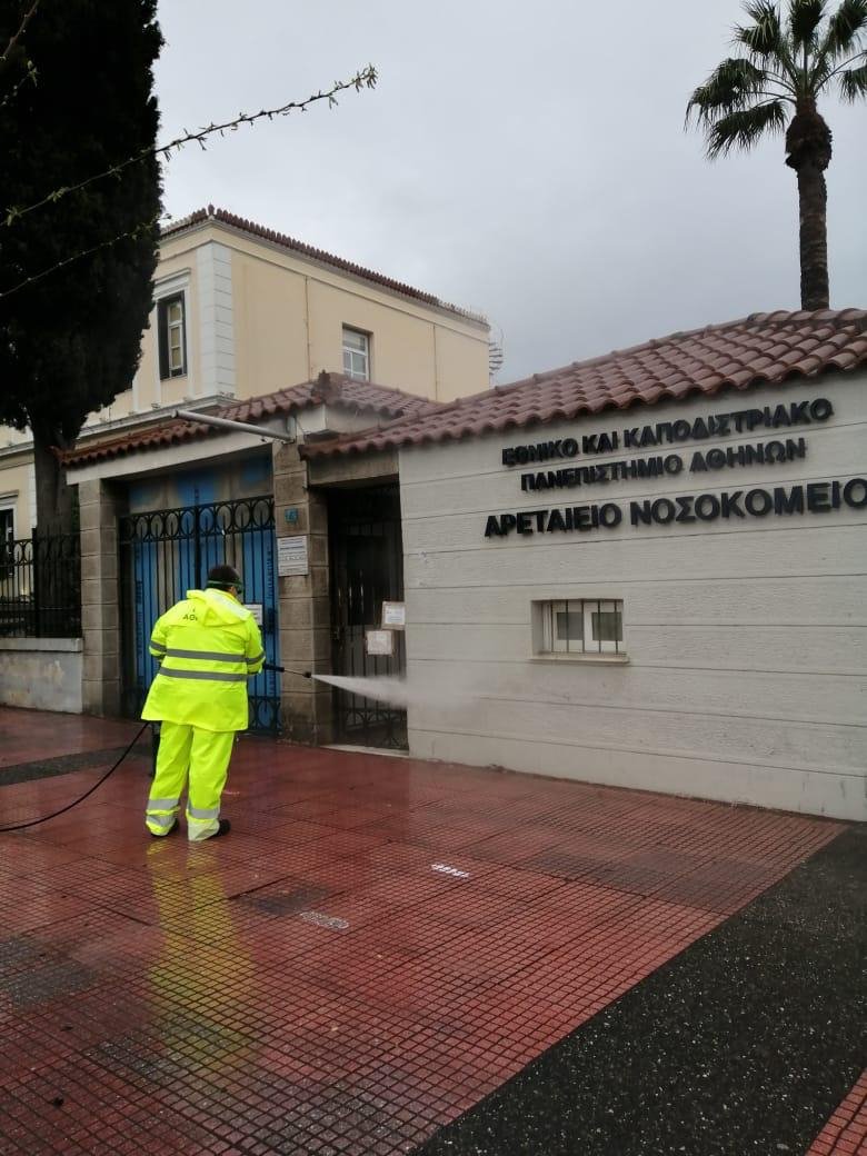 Παράλληλα, απολυμάνσεις γίνονται σε τακτικά χρονικά διαστήματα και σε χώρους έξω από ιδιωτικές κλινικές ενώ συνεχίζονται με πολύ μεγάλες δυνάμεις σε πεζοδρόμια, πεζόδρομους, πλατείες, χώρους έξω από σταθμούς μετρό και τρένων, στάσεις λεωφορείων, εκκλησίες, δημόσια και δημοτικά κτίρια αλλά και όπου χρειάζεται προκειμένου να προστατευθεί η δημόσια υγεία.