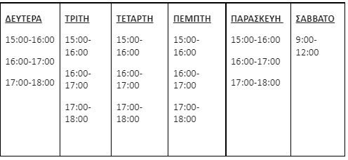 Δευτέρα: 15.00-20.00 |Τρίτη: 16.00-21.00 |Τετάρτη: 16.00-21.00 | Πέμπτη: 16.00-21.00 | Παρασκευή: 15.00-20.00 |Σάββατο: 09.30-14.30