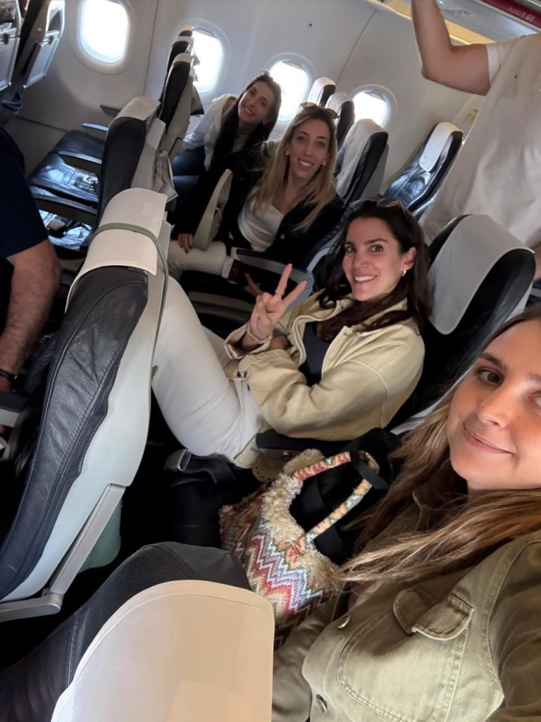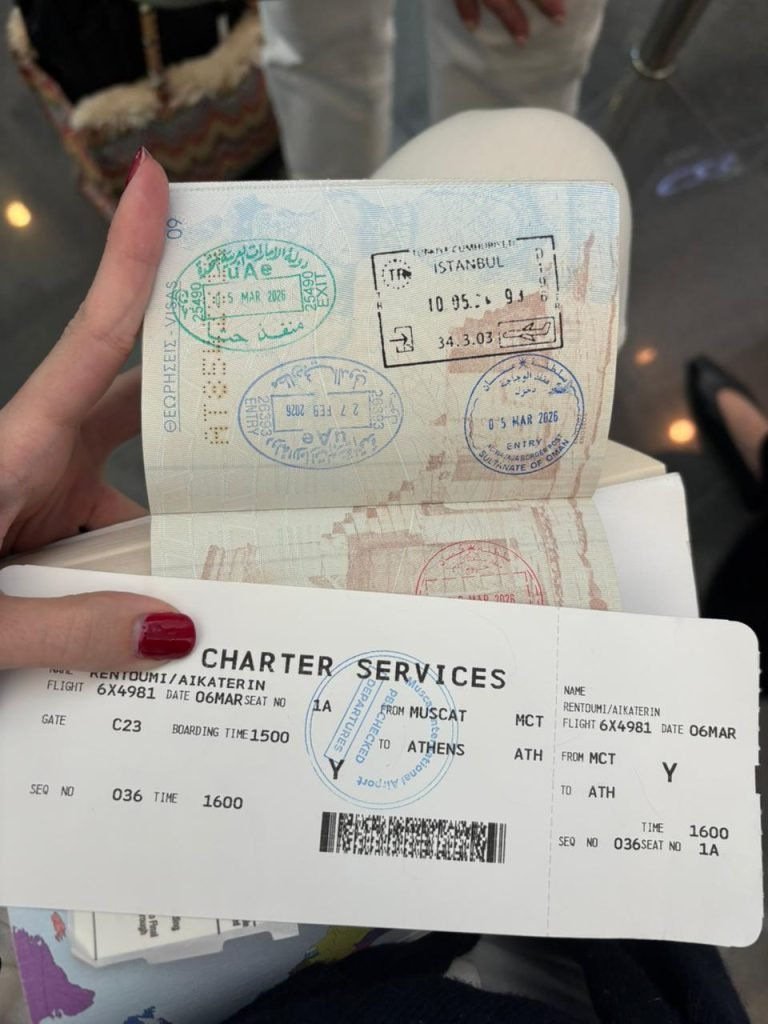Ταξίδεψε, λοιπόν, με την ειδική πτήση επαναπατρισμού της Aegean η Σοφία Μητσοτάκη στις 6 Μαρτίου 2026 από το Ομάν στην Αθήνα; Σε επικοινωνία που είχαμε μαζί της, η Σοφία Μητσοτάκη μας παραχώρησε προσωπικές φωτογραφίες που τραβήχτηκαν μέσα από το αεροπλάνο της Aegean, μαζί με τρεις συνεπιβάτριές της (εμφανές το διακριτικό σήμα της Aegean στο κάλυμμα των καθισμάτων):