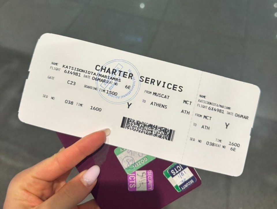 Με βάση την κάρτα επιβίβασης της Σοφίας Μητσοτάκη, η πτήση της Aegean είχε κωδικό 6X4981 και αναχωρούσε στις 16:00 (τοπική ώρα), με προορισμό την Αθήνα. Ανατρέχοντας στο ιστορικό των αναχωρήσεων του Διεθνούς Αερολιμένου του Μουσκάτ, στο Flightradar24, εντοπίσαμε μία και μοναδική πτήση της Aegean στις 6 Μαρτίου 2026 με κωδικό AEE4981 (ίδιος καταληκτικός αριθμός με αυτόν της κάρτας επιβίβασης), που αναχωρούσε στις 16:00 με προορισμό την Αθήνα.