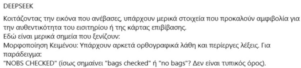 Αντίστοιχα το Deepseek, που επικαλέστηκαν άλλοι χρήστες, αδυνατεί να διαβάσει τη σφραγίδα του αεροδρομίου και επινοεί μια λέξη ανύπαρκτη, το “NOBS CHECKED” αντί για το ακρωνύμιο “PBS”, που αντιστοιχεί στο Passenger Boarding System του αεροδρομίου του Μουσκάτ. Πρόκειται για τη διαδικασία ηλεκτρονικού ελέγχου των καρτών επιβίβασης των ταξιδιωτών, η οποία πραγματοποιείται στην εκάστοτε πύλη αναχώρησης.