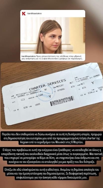 Η Σοφία Μητσοτάκη απάντησε στους ισχυρισμούς αναρτώντας ένα στόρυ στον λογαριασμό της στο Instagram. Συγκεκριμένα, ανάρτησε την κάρτα επιβίβασής της, αναφέροντας ότι ταξίδεψε στις 6 Μαρτίου 2026, με “προγραμματισμένη πτήση charter” της Aegean από το Ομάν, και όχι από το Ντουμπάι, ενώ προχώρησε και σε εξώδικο εναντίον του φερόμενου ως αρχισυντάκτη του “Καρδίτσα στα Άκρα”.