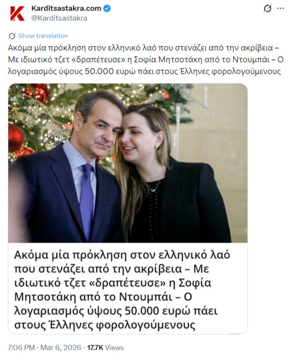 «Στις 6 Μαρτίου 2026, το site “Καρδίτσα στα Άκρα” ισχυρίστηκε ότι η Σοφία Μητσοτάκη, στο πλαίσιο της διαδικασίας επαναπατρισμού Ελλήνων που είχαν εγκλωβιστεί σε χώρες της Μέσης Ανατολής εξαιτίας του πολέμου στο Ιράν, έφυγε από το Ντουμπάι με ιδιωτικό τζετ, γεγονός που κόστισε στους Έλληνες φορολογούμενους 50.000 ευρώ. Είχε προηγηθεί, στις 5 Μαρτίου 2026, δημοσίευμα της σελίδας Voice News (το οποίο έχει πλέον κατέβει), που ανήκει στο μιντιακό σύμπλεγμα που προωθεί τον Κυριάκο Βελόπουλο, με τη μορφή αποκλειστικής είδησης και επικαλούμενο “αυτήκοες μάρτυρες” – ότι ο πρωθυπουργός, Κυριάκος Μητσοτάκης, απαιτούσε ωρυόμενος να επιστρέψει η κόρη του πάση θυσία από το Ντουμπάι με ιδιωτικό τζετ.