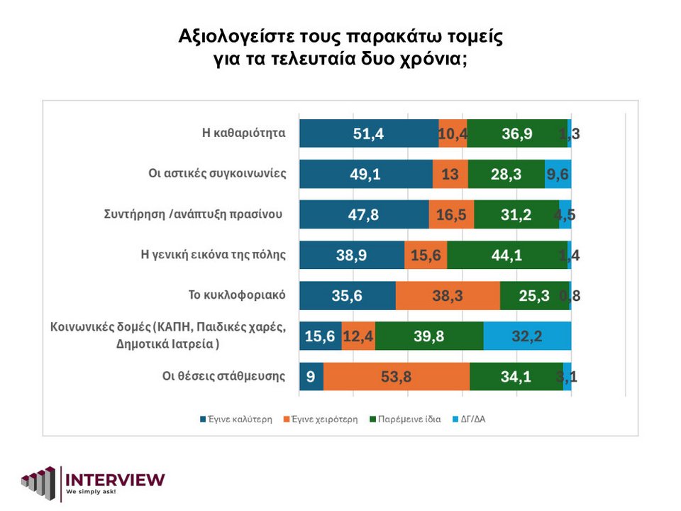 Παράλληλα, το 45% των κατοίκων δηλώνει ότι τα τελευταία δύο χρόνια η ζωή στην πόλη έχει βελτιωθεί. Η ανάληψη της διοίκησης από τη νέα δημοτική αρχή δημιούργησε την αίσθηση επανεκκίνησης, μια δυναμική που φαίνεται να διατηρείται καθ’ όλη τη διάρκεια της μέχρι τώρα θητείας.