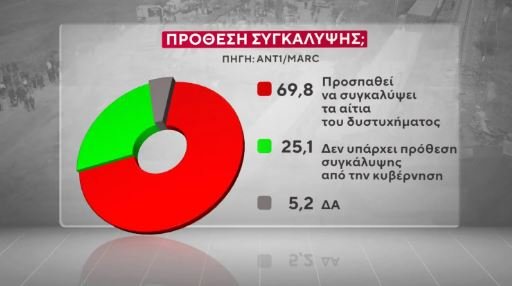 Αναφορικά με τα Τέμπη, το 69,8% θεωρεί πως η κυβέρνηση επιχειρεί συγκάλυψη, κάτι στο οποίο διαφωνεί το 25,1%.