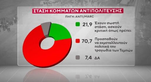 Τέλος, για τη στάση των κομμάτων της αντιπολίτευσης, το 70,7% θεωρεί πως προσπαθούν να εκμεταλλευτούν πολιτικά την τραγωδία των Τεμπών.