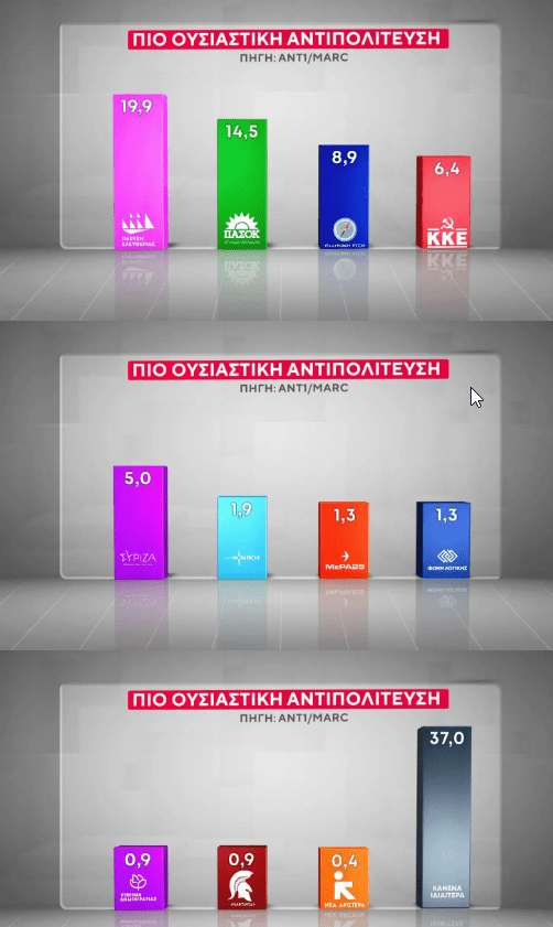 Στο κομμάτι της πιο ουσιαστικής αντιπολίτευσης, η Ζωή Κωνσταντοπούλου κερδίζει κατά κράτος το ΠΑΣΟΚ, έχοντας 19,9% έναντι 14,5%. Ακολουθεί η Ελληνική Λύση με 8,9%, το ΚΚΕ με 6,4% και ο ΣΥΡΙΖΑ με 5%.