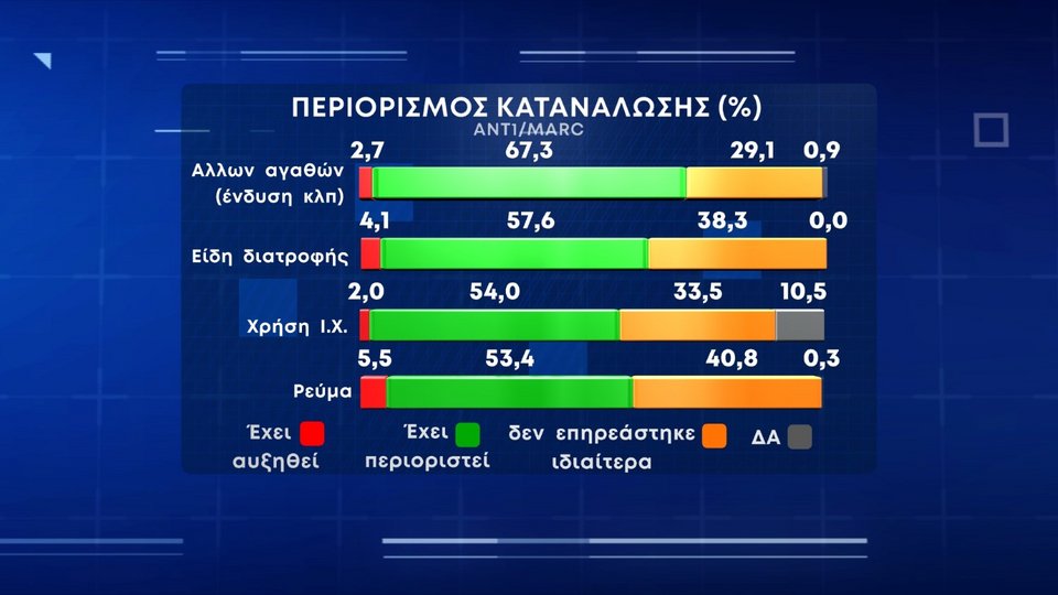 Σχετικά με τον περιορισμό της κατανάλωσης, το 67,3% των πολιτών που συμμετείχαν στην έρευνα έχει «κόψει» αγαθά, όπως η ένδυση, το 57,6% έχει περιορίσει τα είδη διατροφής και το 54% τη χρήση ΙΧ, ενώ το 53,4% έχει περιορίσει τη χρήση του ηλεκτρικού ρεύματος.