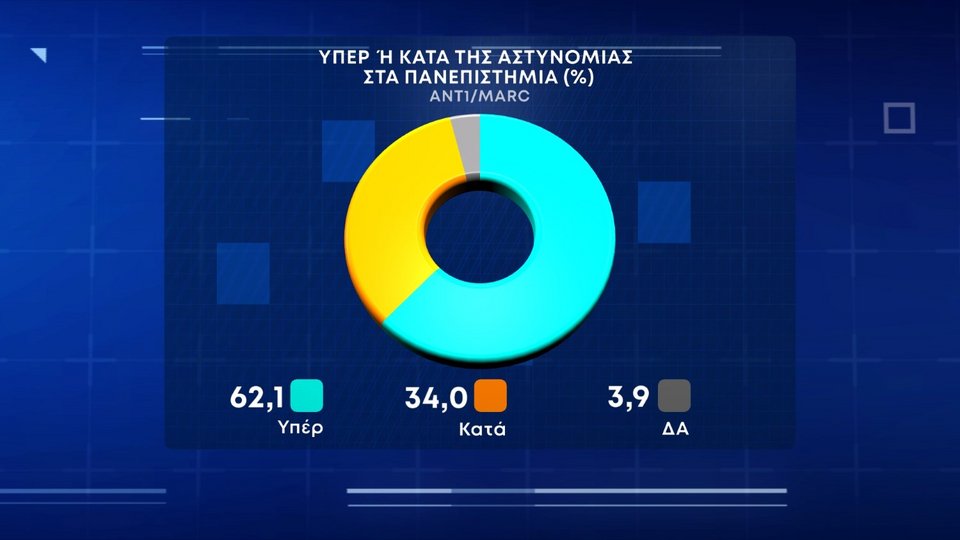 Αναφορικά με την Πανεπιστημιακή Αστυνομία, το 62,1% τάσσεται υπέρ, έναντι του 34% που αντιδρά.
