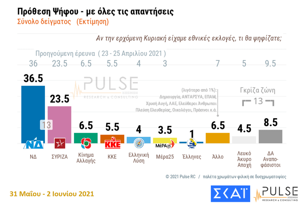 Με βάση την πρόθεση ψήφου αν την επόμενη Κυριακή είχαμε εκλογές, η ΝΔ θα έπαιρνε ποσοστό 36,5% και ο ΣΥΡΙΖΑ 23,5%, μια διαφορά της τάξης του 13%. Τρίτο κόμμα το ΚΙΝΑΛ (6,5%) και ακολουθούν ΚΚΕ (5,5%), Ελληνική Λύση (4%) και ΜέΡΑ25 (3,5%).
