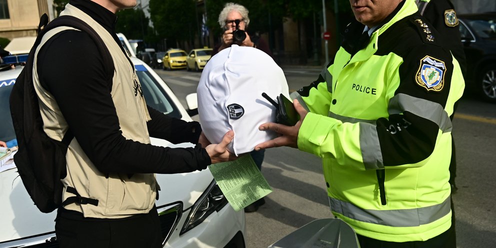 Αστυνομικοί της Τροχαίας σταματούν αυτή την ώρα στην Αττική μοτοσικλετιστές στην άκρη του δρόμου και δίνουν δωρεάν κράνη σε όσους δεν τα φορούν, όπως φαίνεται στις φωτογραφίες.