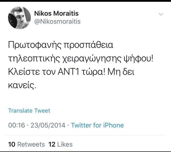 Το επίμαχο tweet του Νίκου Μωραΐτη: