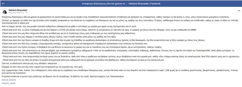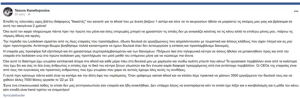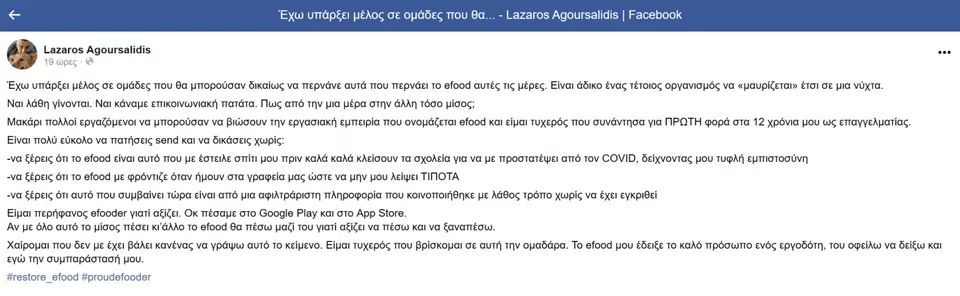 Αν και κάποιοι βλέπουν με καχυποψία την όλη κινητοποίηση στα social media από την πλευρά των efooders, δεν παύει να είναι η δική τους πλευρά και η διήγηση των γεγονότων και των εργασιακών συνθηκών από ανθρώπους που τις βιώνουν.
