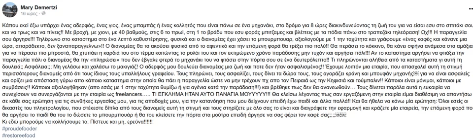 Μπροστά σε όλο αυτό το σάλο λοιπόν, οι ίδιοι οι εργαζόμενοι της e-food ένιωσαν την ανάγκη να βγουν και να μιλήσουν κι αυτοί δημόσια και να περιγράψουν όλα όσα βιώνουν από πρώτο χέρι.