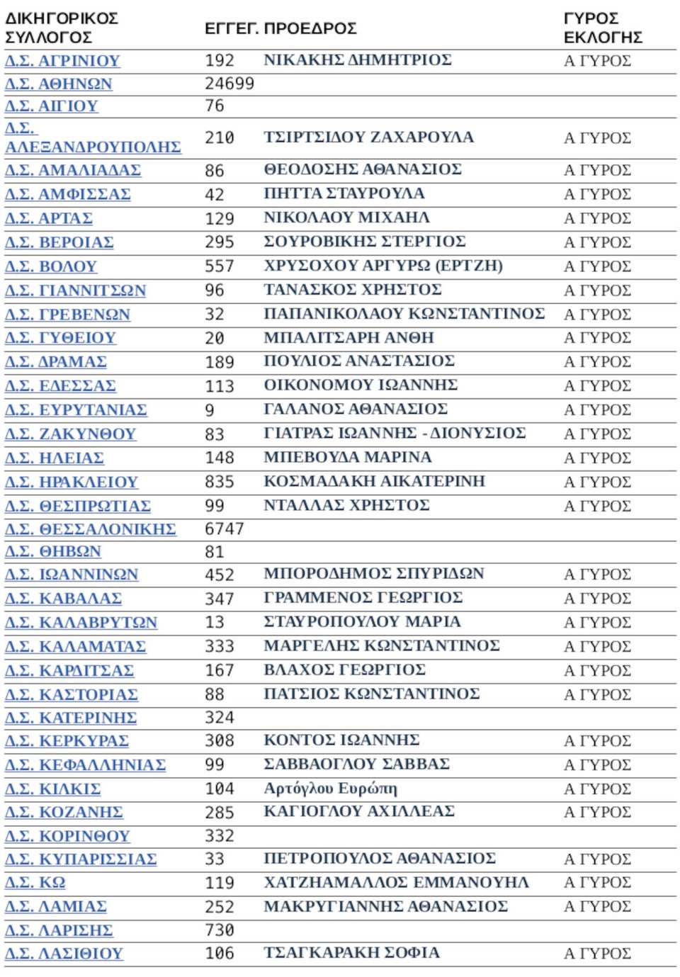 Σύμφωνα με τα επίσημα στοιχεία από την Ολομέλεια των Δικηγορικών Συλλόγων, οι αριθμοί των εκλογών μετά τον α΄ γύρο είναι οι παρακάτω: