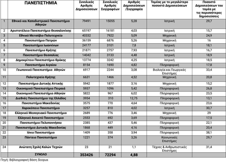 Σύμφωνα με τα στοιχεία που συγκεντρώθηκαν από τη βάση και αφορούν την ερευνητική παραγωγή των ελληνικών πανεπιστημίων μέχρι τις 6 Αυγούστου 2020, το Εθνικό και Καποδιστριακό Πανεπιστήμιο Αθηνών βρίσκεται στην πρώτη θέση μεταξύ των ελληνικών πανεπιστημίων με 79.491 ερευνητικά κείμενα (βλ. Πίνακα 1). Παράλληλα θα πρέπει να επισημανθεί ότι: