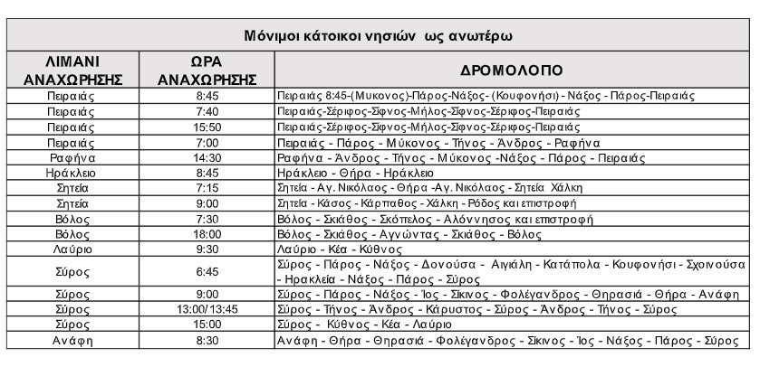 20% έκπτωση στα εισιτήρια επιβάτη σε όλα τα νησιά του Αιγαίου στα δρομολόγια όπως αναφέρονται στον παρακάτω πίνακα (για τους μόνιμους κατοίκους Δωδεκανήσων έκπτωση 40% στη γραμμή Σητεία - Δωδεκάνησα).
