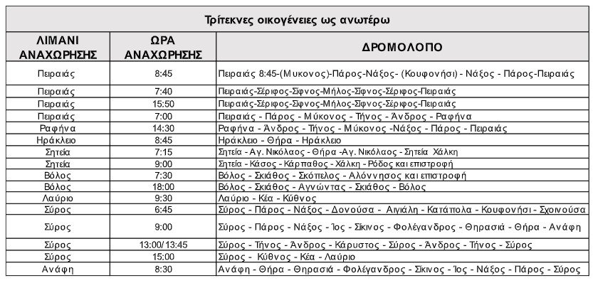 30% έκπτωση στα εισιτήρια επιστροφής επιβάτη για τους τρίτεκνους με την ταυτόχρονη έκδοση εισιτηρίων μετ’ επιστροφής στα δρομολόγια όπως αναφέρονται στον παρακάτω πίνακα (για τους πολύτεκνους ισχύει ήδη η έκπτωση 50%).