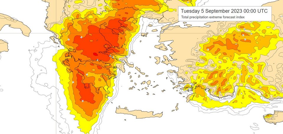 Τα τελευταία προγνωστικά στοιχεία του Εθνικού Αστεροσκοπείου Αθηνών/meteo.gr δείχνουν ότι η χώρα μας θα είναι πιο βροχερή περιοχής της Ευρώπης την πρώτη εβδομάδα του Σεπτεμβρίου. Μάλιστα, αξιόλογες βροχοπτώσεις προβλέπονται και στον Έβρο την Τρίτη 5/9, όπου μαίνονται οι πυρκαγιές.