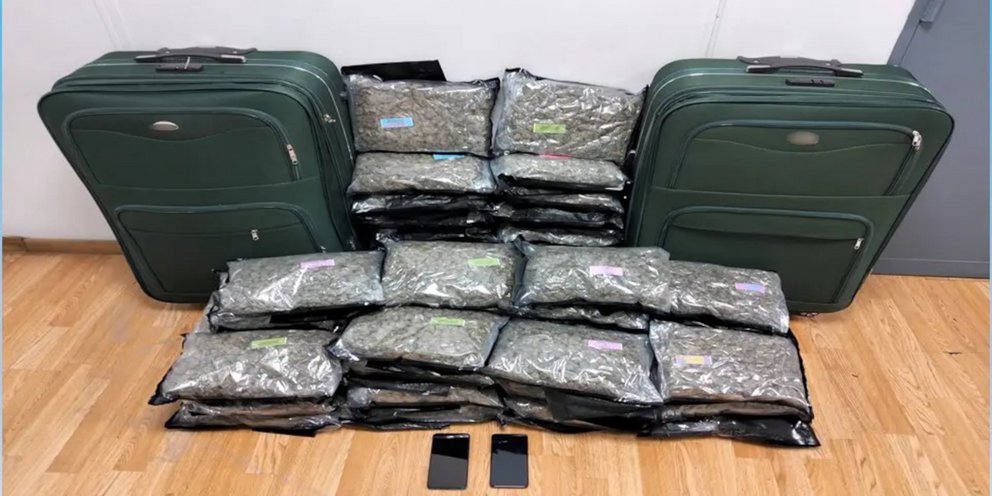 Από τον έλεγχο που πραγματοποιήθηκε στις αποσκευές της, κατελήφθη να έχει αποκρύψει, σε νάιλον συσκευασίες, 24 κιλά και 500 γραμμάρια ακατέργαστης κάνναβης υδροπονικής καλλιέργειας (skunk). Επιπλέον, βρέθηκαν και κατασχέθηκαν 2 κινητά τηλέφωνα.