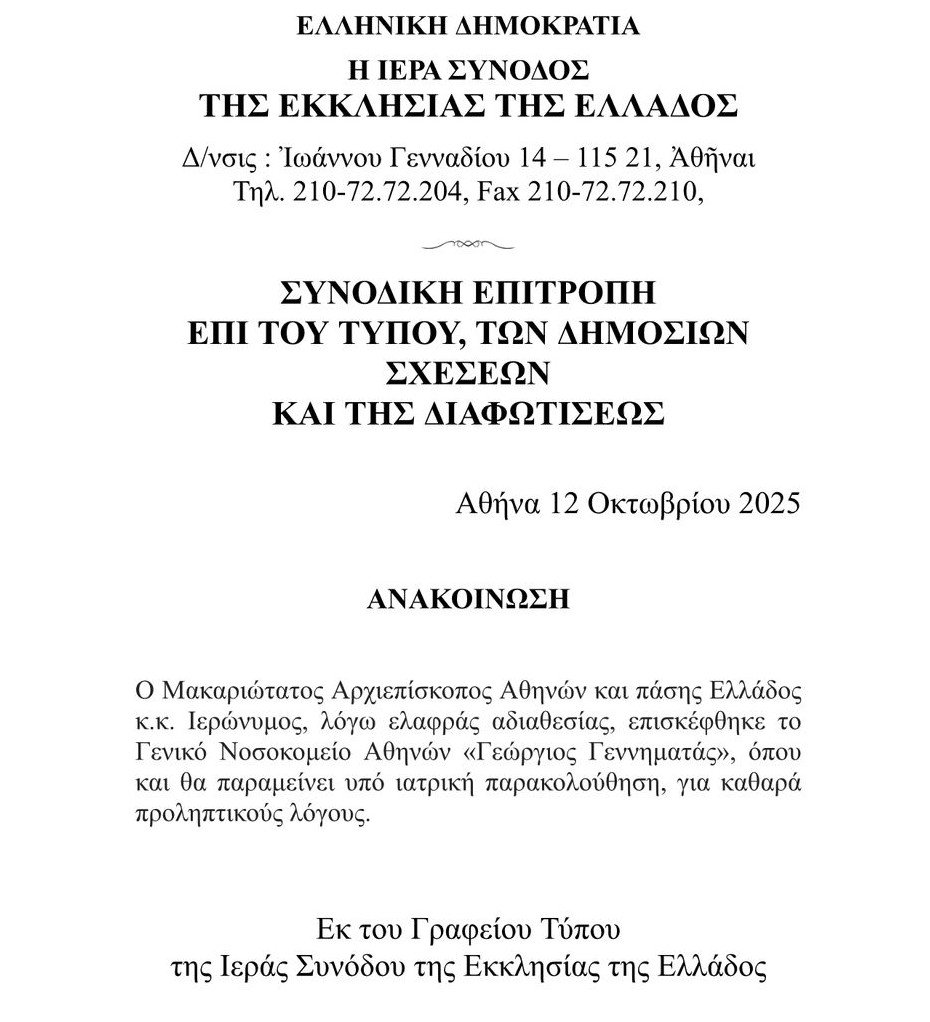 Ο Μακαριώτατος Αρχιεπίσκοπος Αθηνών και πάσης Ελλάδος κ.κ. Ιερώνυμος, λόγω ελαφράς αδιαθεσίας, επισκέφθηκε το Γενικό Νοσοκομείο Αθηνών «Γεώργιος Γεννηματάς», όπου και θα παραμείνει υπό ιατρική παρακολούθηση, για καθαρά προληπτικούς λόγους.