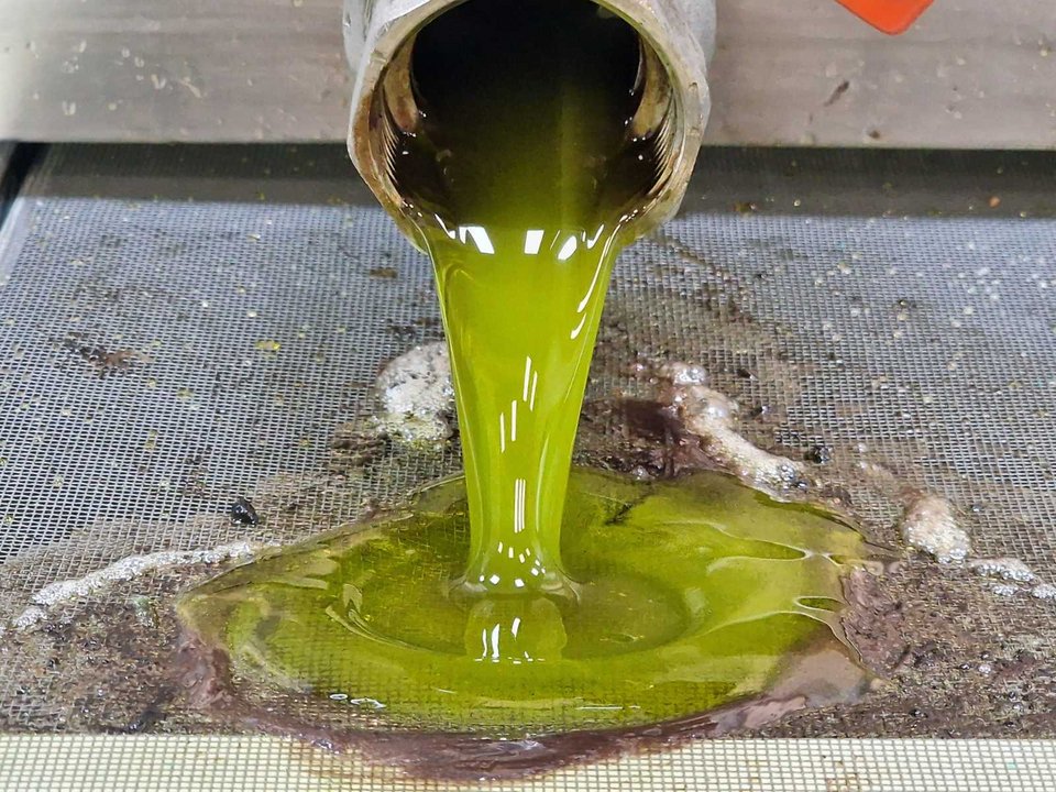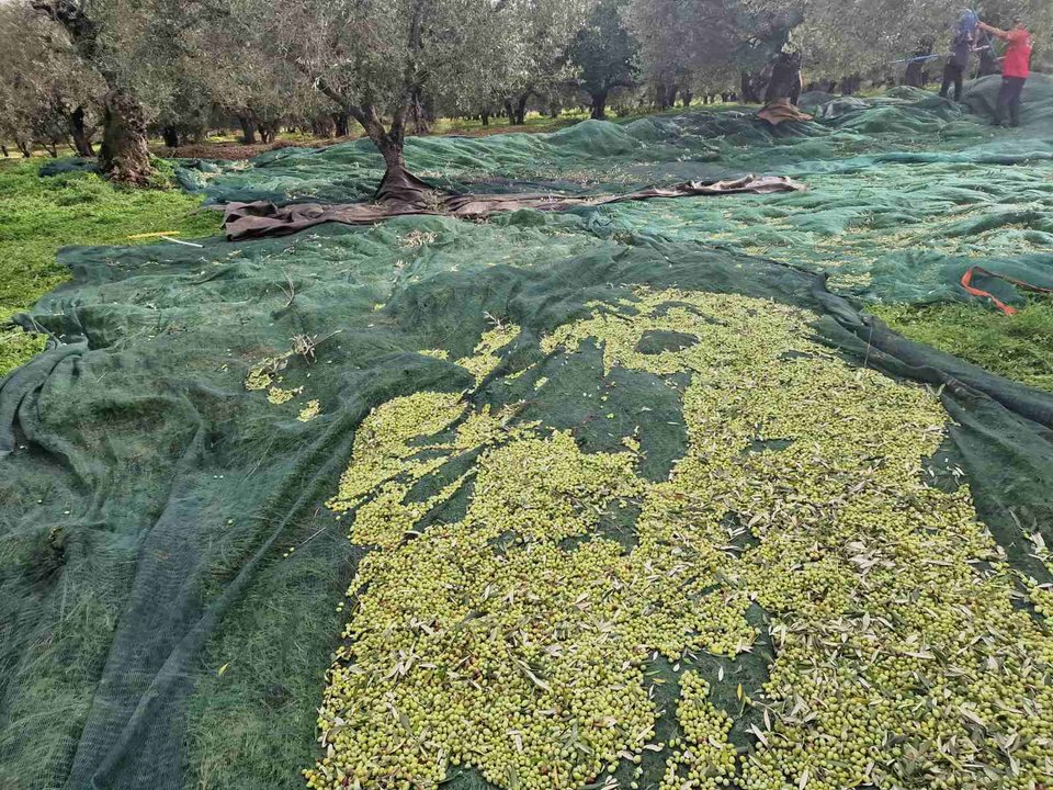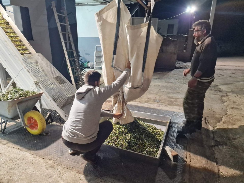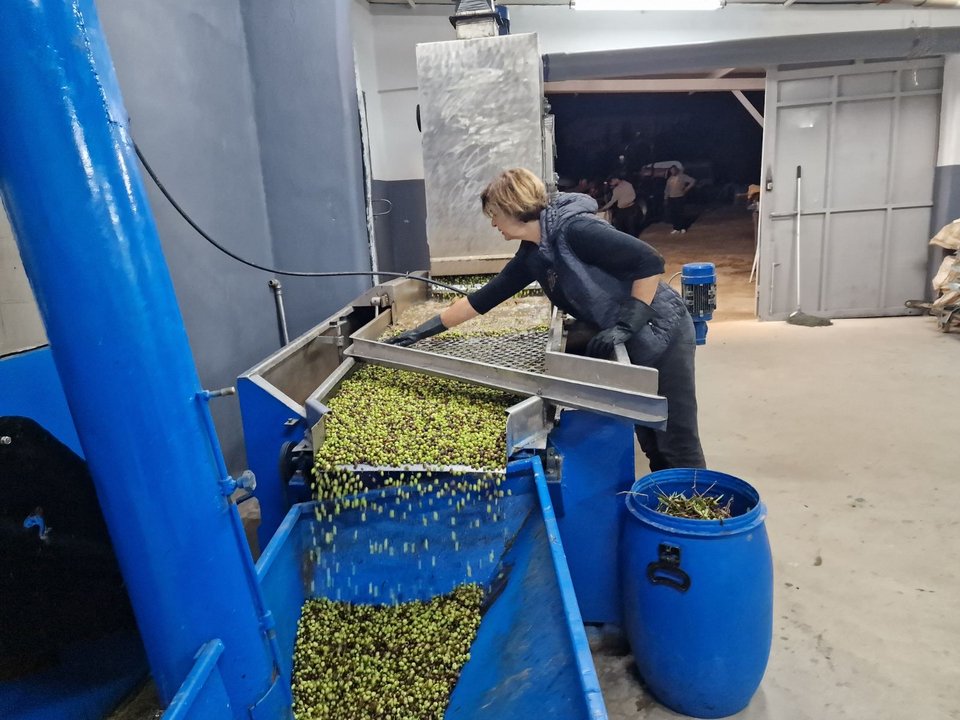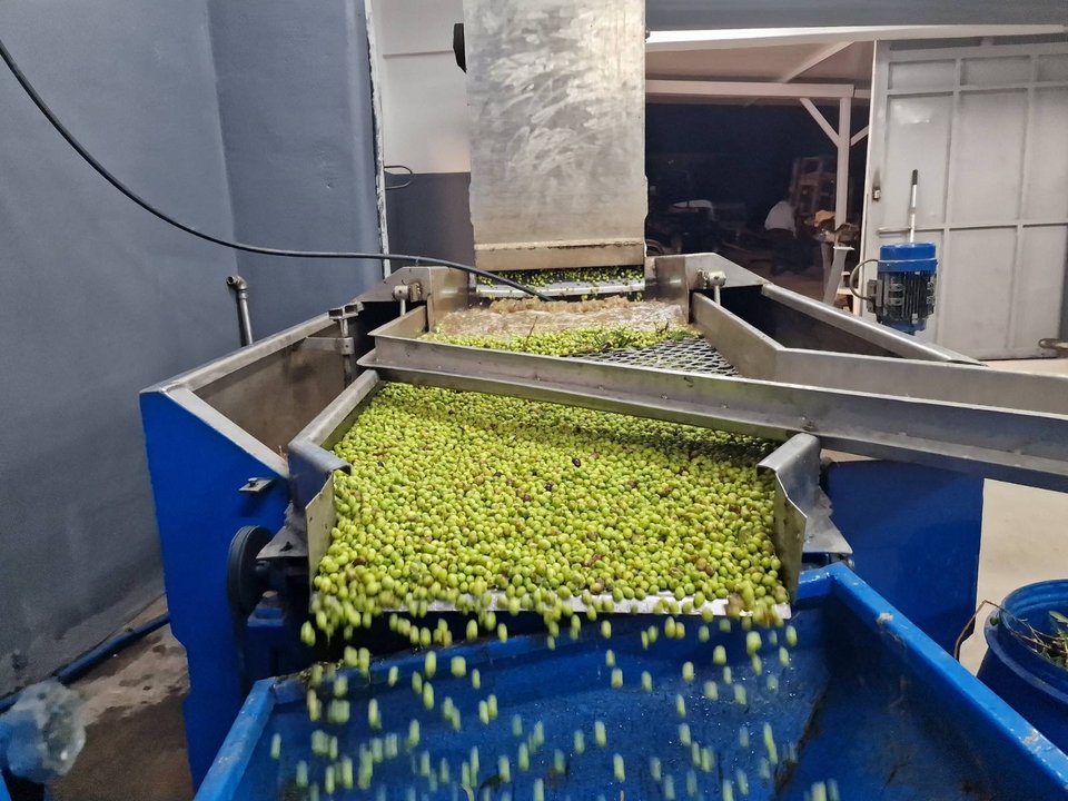 Στον προαύλιο χώρο τρακτέρ και μικροί γερανοί πηγαινοέρχονται ασταμάτητα μεταφέροντας τους σάκους με τον καρπό στο χώρο υποδοχής . Αφού πλένονται οι ελιές συνθλίβονται στο επόμενο στάδιο και η αλυσίδα των μηχανημάτων καταλήγει σε μεγάλους σωλήνες από τους οποίους τρέχει ο «πράσινος χρυσός», ο πρωταγωνιστής της μεσογειακής διατροφής.