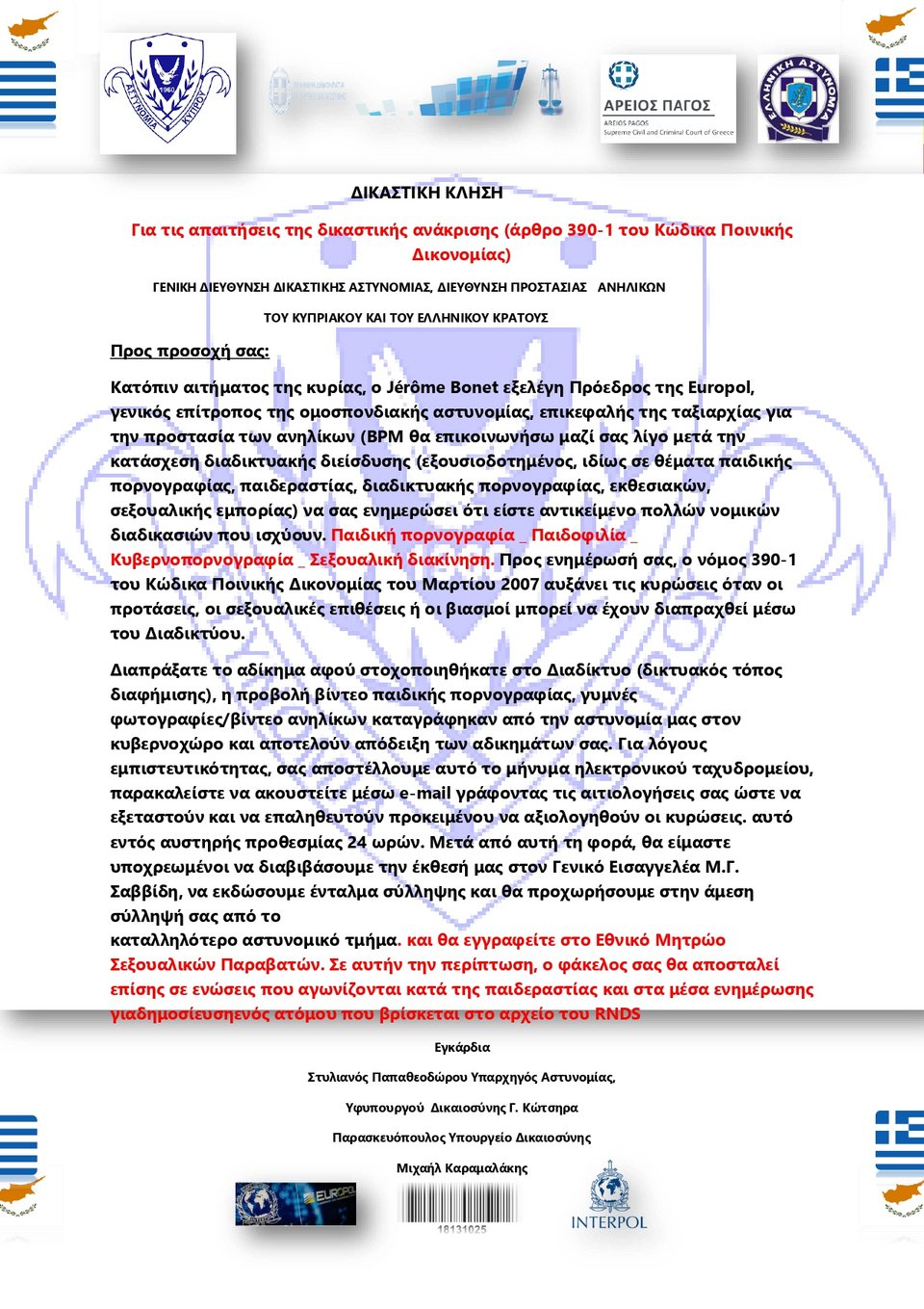 Παράλληλα, στην προσπάθειά τους να προσδώσουν «αληθοφάνεια» στη σχετική επιστολή, χρησιμοποιούν τα λογότυπα της Ελληνικής Αστυνομίας, της Αστυνομίας Κύπρου, του υπουργείου Δικαιοσύνης, καθώς και δικαστικών αρχών και αρχών επιβολής του νόμου.